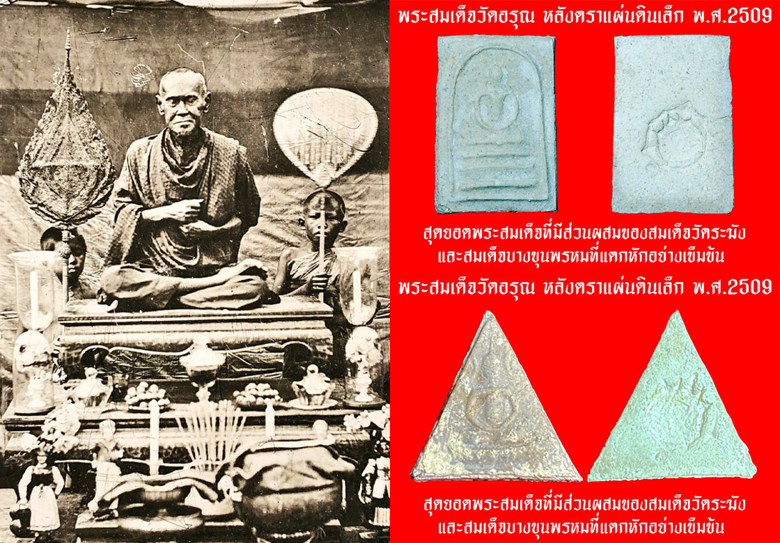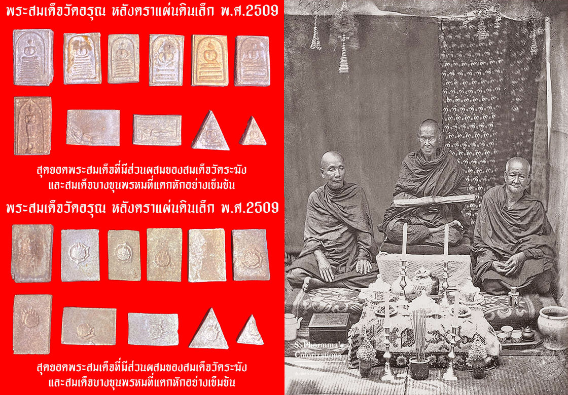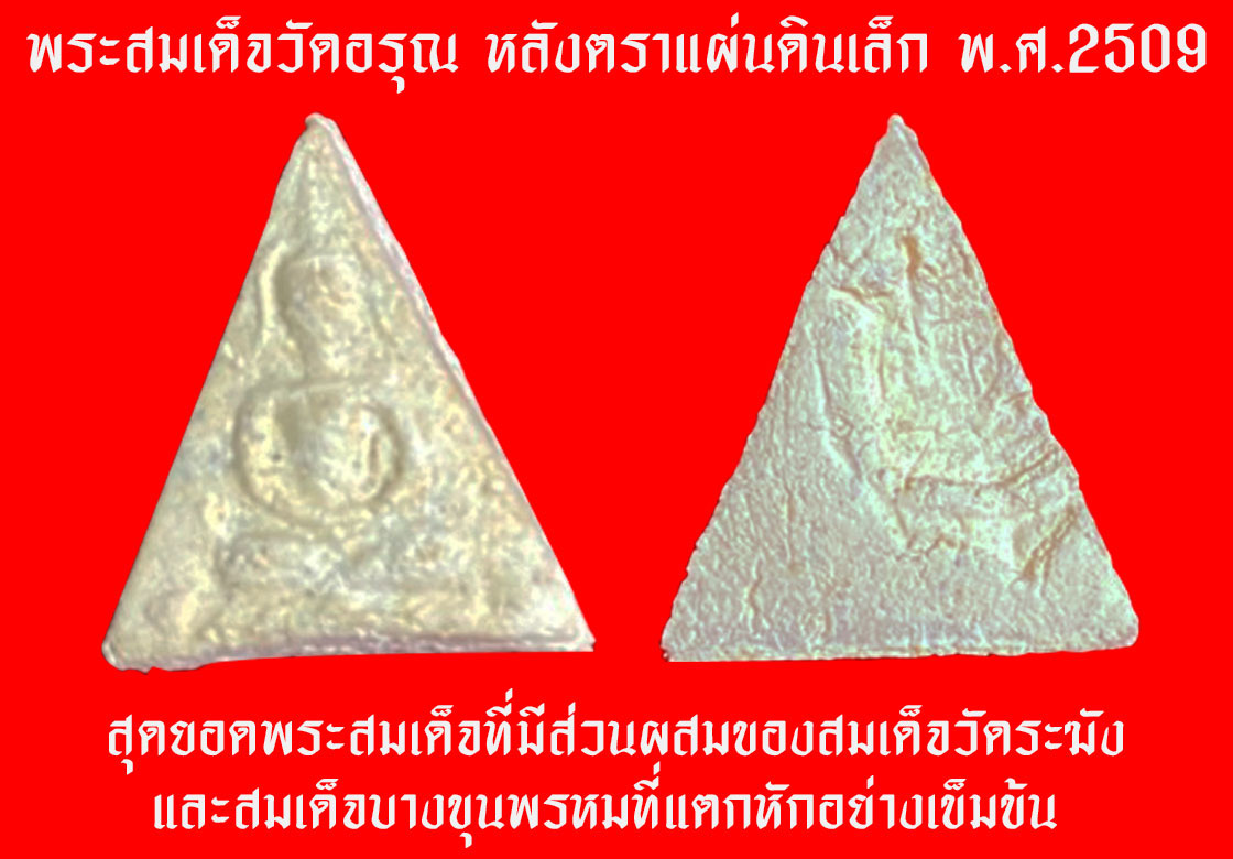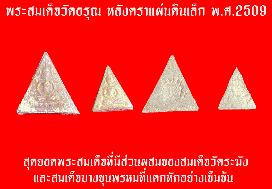 หมายเหตุ พระสมเด็จวัดอรุณ หลังตราแผ่นดินเล็ก ปี 2509 ของดีวัดอรุณราชวราราม ที่มีส่วนผสมของพระสมเด็จวัดระฆังและพระสมเด็จวัดบางขุนพรหมที่แตกหักอย่างเข้มข้น รุ่นนี้เป็นวัตถุมงคลของวัดอรุณราชวรารามที่เปรี่ยมล้นด้วยพุทธคุณ ไม่ว่าจะเป็นมวลสารของพระสมเด็จวัดระฆังและพระสมเด็จวัดบางขุนพรหม ที่สร้างโดย สมเด็จพระพุฒาจารย์ (โต พฺรหฺมรํสี) วัดระฆัง ซึ่งเป็นส่วนผสมหลักในการสร้างพระสมเด็จวัดอรุุณชุดนี้